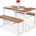 • Modern 3-Piece Dining Set Wood Top White Metal Frame Table and 2 Bench Chairs