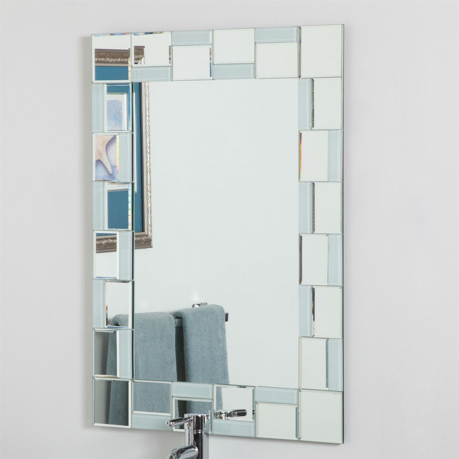Sandblasted and mirror hand cut and beveled mirrors mark the border of this Contemporary 31.5 x 23.6 inch Rectangle Bathroom Mirror with hand cut Mirrors Edging. Made from over 40 hand cut and beveled pieces of glass.