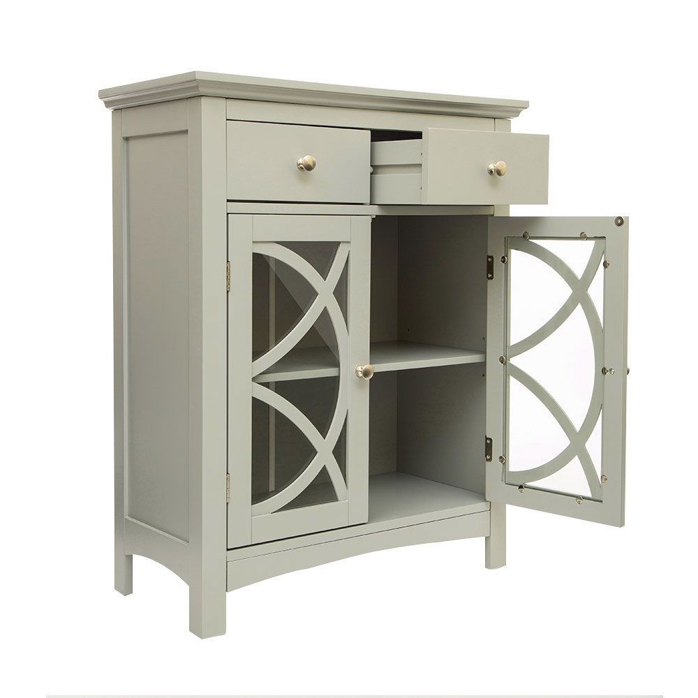 This Modern 32-inch Bathroom Floor Cabinet with Glass Doors in Gray Wood Finish makes an ideal storage or display solution for your home. This storage cabinet with double doors features several storage areas with shelves and a drawer. It offers ample space for accessories such as books, dinnerware, towels and more. The elegant finish and accompanying ergonomic handles will complement any home decor. The Storage Cabinet requires easy assembly with household tools. Product Specifications Package include: Cabinet piece pack x1pc, Hardware pack x1, Instruction x1 Color info: Gray Material: 100% MDF wood Size:26″L*12.4″W*32.1″H Product Warranty.