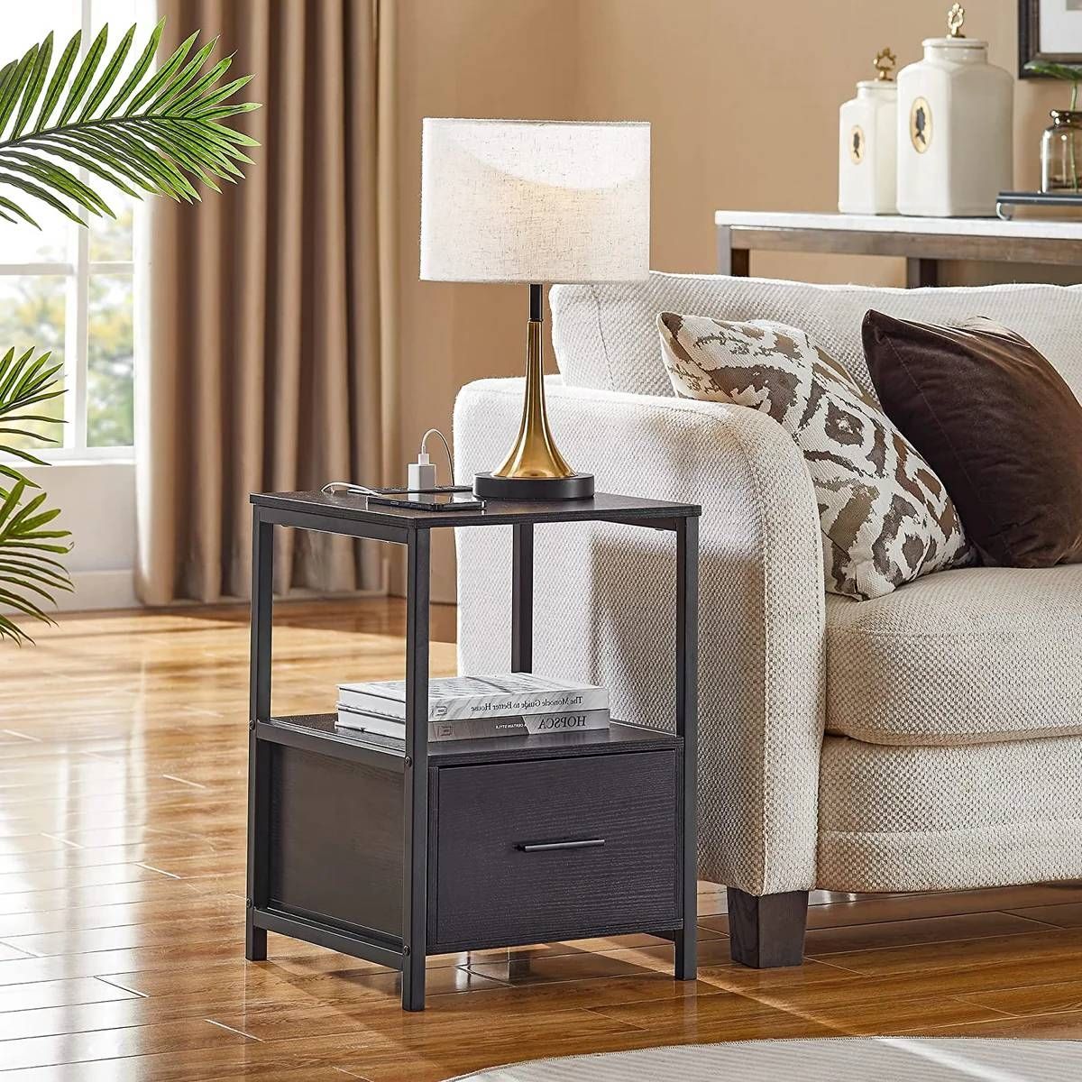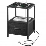 This Modern Black Metal Wood Side End Table Nightstand Shelf with USB Charging Ports features 2 AC outlets and 2 USB ports. Easily charge your phone, tablet, desk lamp or laptop. Handy for your place as everything needed is within your armÂ’s reach. 2 Open shelves offer sufficient storage space for storing and displaying. A bottom drawer can store private things or other stuff you want to put inside. ItÂ’s great for your living room, bedroom, home office and small spaces. It is not only a rechargeable end table, but also can be used as a nightstand, telephone table, sofa table, kids’ night table, it is a great addition to your room. You can explore more ways to use it. The nightstand is composed of wood board and a sturdy metal frame, ensuring sturdiness and stability for years of use. Foot pads can protect the floor from scratches. Load capacity up to 52 lb. With simple construction and clear instruction, even a child can complete the assembly of a chairside table quickly without great effort; So don’t wait any longer and enjoy it to your home right now. Give this gift to the person you want to care about most! The bedside tables with charging stations are meaningful gifts for your lover, parents, and friends.