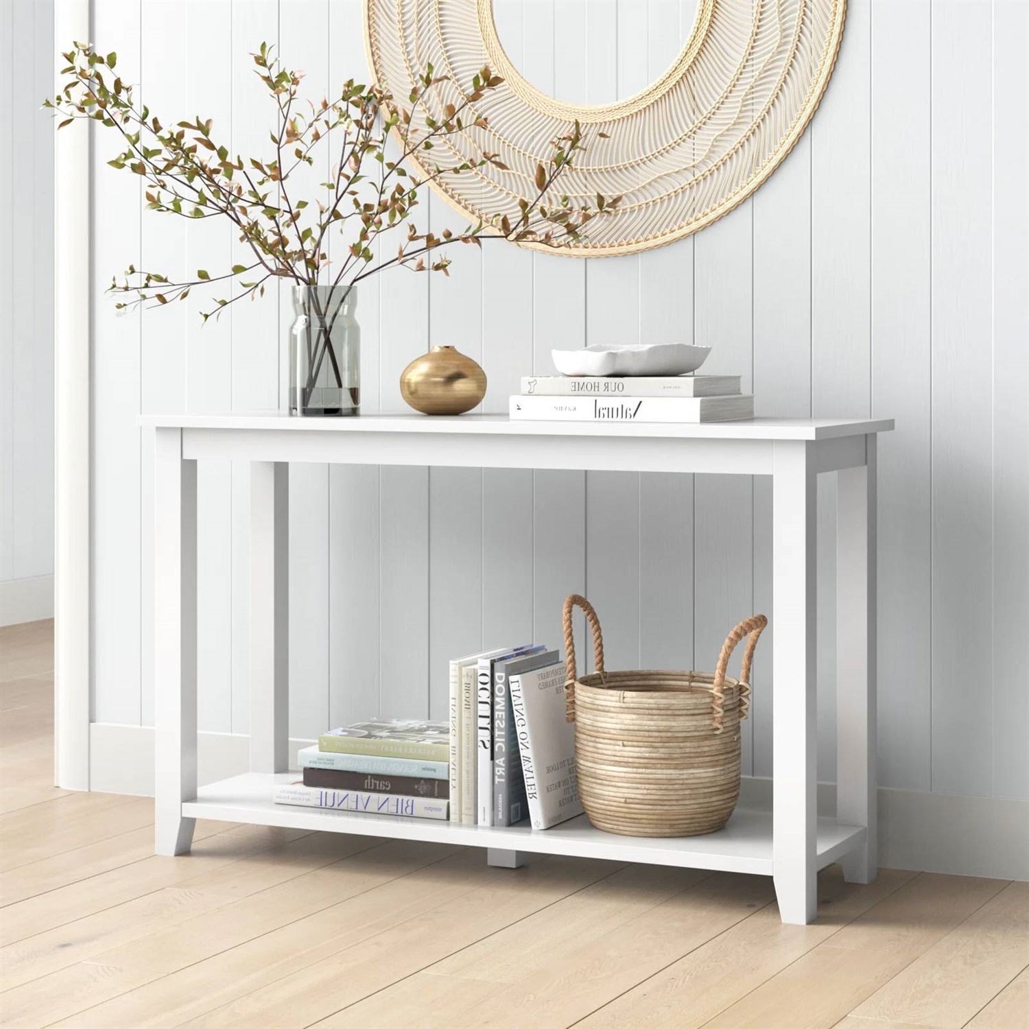 - Modern Coastal Farmhouse Console Sofa Table in White Wood Finish