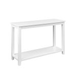 This Modern Coastal Farmhouse Console Sofa Table in White Wood Finish features clean lines and a distressed finish that blends modern style with coastal farmhouse charm. It has a minimalist silhouette and is crafted from engineered wood. The neutral stain means you’re able to match almost any style or color scheme you want. Rectangular in shape, the lower shelf gives you ample space to keep books and baskets organized, while the top is ideal for an accent lamp and other decor. At 30″ tall and 48″ wide, this table fits nicely behind your living room sofa or against the wall in your hallway or entryway.