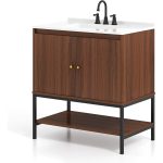 - Modern Freestanding Bathroom Vanity in Walnut Wood Finish with Sink and Faucet