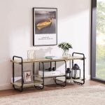The Modern Grey Wood and Metal Entertainment Center TV Stand for TV up to 60-inch is made of solid engineered wood and metal frame. It is sturdy and not rickety. The metal tubes are tightly under the board which could provide the enough support for loading capacity. Each of the middle board could hold up to 59lb. The industry console table has two colors (brown and grey) and three size (55/63/71 inches) for you, which fits the TV range up to (65/75/84 inches). With upgrading of material, this TV table is waterproof. Only one damp cloth will help you quickly and easily clean the stain. The entertainment center table has a large tabletop for your TV and items. At the same time, the TV stand features 4 separate shelves areas, which could provide enough space for your DVDs, media and other ornament items. All parts of the TV stand are clearly labeled, the hardware and tools are packed in a box, no additional tools required. With our easy-to-follow instructions and instructional videos, these parts are not too hard to put together by yourself. Get a chance to enjoy relaxing hands-on time!