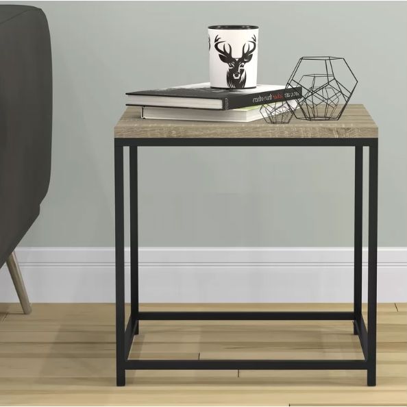 Contemporary design meets industrial aesthetics in this Modern Metal Frame End Table Nightstand with Taupe Finish Wood Top Side Table. Crafted of solid birch and manufactured wood, the tabletop strikes a clean-lined square silhouette with faux woodgrain veneers. Featuring four straight legs, a sleek black metal sled base rounds out the design. Measuring 16″ H x 16″ W x 16″ D overall, this table has a 100 lbs. weight capacity – perfect for displaying everything from remotes and coasters, to appetizers and drinks at your next get-together.