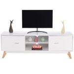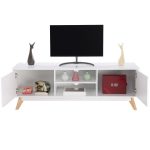 Modern Mid Century Style White TV Stand with Wood Legs Brand new and high quality Simple and elegant design Four pine table legs, stable and durable With two wide holes at the back for all your cords and wires go through The stand consists of 2 cupboards and 2 display shelves All with a big capacity to satisfy your demand to place things you need Simple stylish design comes in an elegant white finish, is functional and suitable for any room Perfect to fit your living room or bedroom