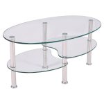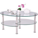Modern Oval Tempered Glass Coffee Table with Bottom Shelf Brand new and high quality Strong and durable tempered glass, providing years of use Smooth and non-angular oval design for more reliable and safe use experience Features 2 bottom shelves, offering more storage space Clean, bright and elegant style Easy to clean and assemble Perfect for living room Assembly required Color: Transparent Material: Tempered glass + metal Weight capacity of the bottom shelf: 45 lbs Package includes: 1 x Coffee table