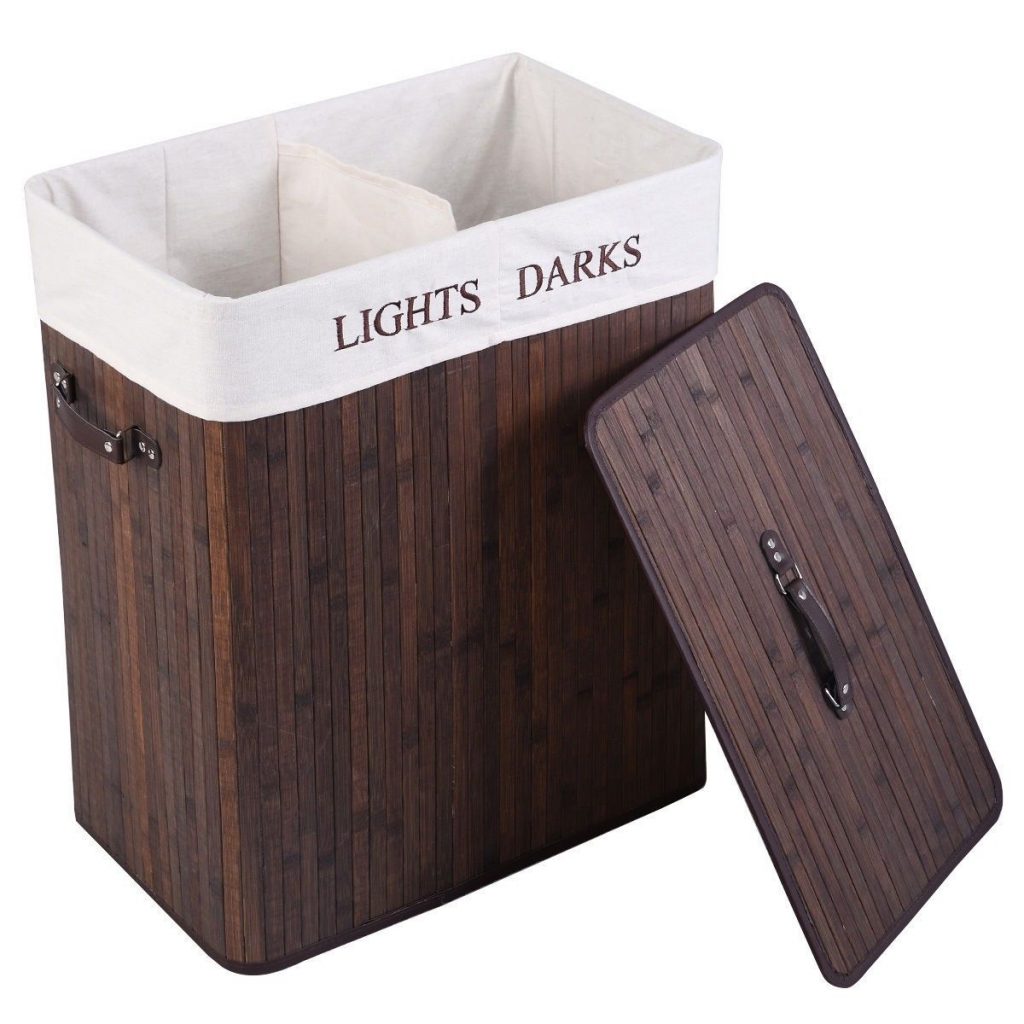 Make your laundry a breeze with this Natural Bamboo 2 Bin Sliding Laundry Hamper with Storage Shelf. Made of 100% nature bamboo material, this laundry hamper basket is stable, durable and safe for long-lasting use. Come with 2 removable fabric bags to help separate washing lights and darks. Has smooth sliding rails and handles, the 2 laundry bags can slide completely out so that you can easily transport them from the hamper to the washing machine.