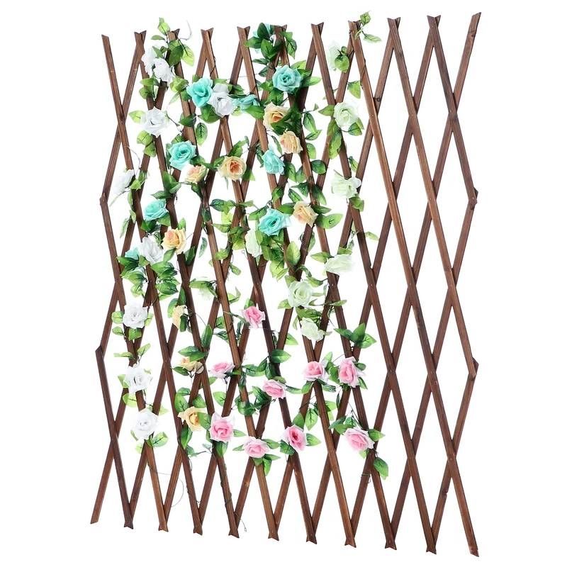 - A folding wood trellis that can be expanded between 10.5 and 98.5 inches in width.