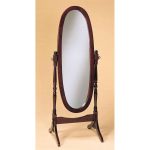 This Cherry Finish Cheval Mirror has beautiful traditional style. Elongated oval glass mirror with wood frame and stand.