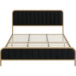 - Queen Gold Metal Platform Bed Frame with Black Velvet Upholstered Headboard