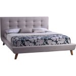 An ideal addition to mid-century suites, this Queen size Mid-Century Style Beige Upholstered Platform Bed elevates a low profile with unmistakably modern details, like a button-tufted headboard and angled wooden legs. Versatile gray upholstery complements any palette you choose throughout the rest of the room.