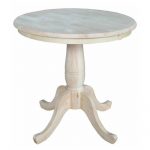 Round 30-inch Unfinished Solid Wood Dining Table with Pedestal Base elegantly enhances your dining area. This wooden dining table features an intricately crafted pedestal base with four legs for optimum stability. It is a versatile enhancement for a traditional, rustic, or cottage style home decor. This table is suitable for both casual and formal settings. Made from solid wood, this dining tableÂ’s solid construction provides years of functionality. This round shape table has a seating capacity of four people. Easy assembly required. This table is easy to care for and can be wiped with a clean and damp cloth. The table is solid wood, it is not scratch resistant nor stain resistant. We always recommend coasters, pot holders, if you spill something on it wipe it up immediately. The table is subject to weathering or fading over time if left in a room near a window for instance; Wipe with a dry cloth.