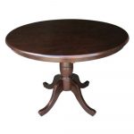 The stately yet compact design of this Round 36-inch Solid Wood Kitchen Dining Table in Rich Mocha is perfect for groups of four to come together in the kitchen for an evening meal. Available in a wide range of finish options and featuring a traditional design, this piece will serve as a charming centerpiece to any décor. Its sturdy build comes from its use of solid wood with a butcher block top supported by a pedestal base with decorative carvings and four curved feet that provide visual flare and unwavering stability. Some assembly is required.
