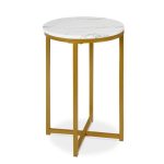 Simplify your home with the super easy to assemble Round Cross Leg Design Coffee Side Table Nightstand with Faux Marble Top White/Gold. Serves as a modest yet classy living room addition for placing magazines, snacks, beverages, or just a decorative centerpiece for any room. The sturdy legs are connected with a cross design for maximum stability under a durable, laminate faux marble table top that holds up to 55 lbs.