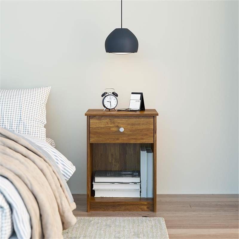 Keep your bedroom essentials and cell phone within arm’s reach on a convenient Nightstand with Drawer. Available in several traditional neutral finishes, this Rusic Brown Oak Farmhouse 1-Drawer Bedroom Nighstand with Open Shelf is the perfect addition to your bedroom. The Nightstand is constructed of laminated particleboard for a cost effective build that is both trendy and functional. The Nightstand has a bottom cubby that can be used to store books or magazines while the drawer offers concealed storage. Use the top surface for a reading lamp or use it to display a few accessories for added style. The Nightstand ships flat to your door and requires assembly upon opening. Two adults are recommended to assemble. Once assembled, the Nightstand measures to be 24.13” H x 17.72” W x 15.67” D.