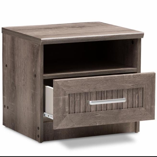 The Rustic FarmHome 1 Drawer Nightstand Natural Oak is the perfect mix of rustic and minimalist blends. This sturdy wooden nightstand boasts a natural oak finish with realistic woodgrain detail. The single drawer sports a vertical slat motif for eye-catching appeal. A single shelf offers additional storage space perfect for your favorite bedroom items.
