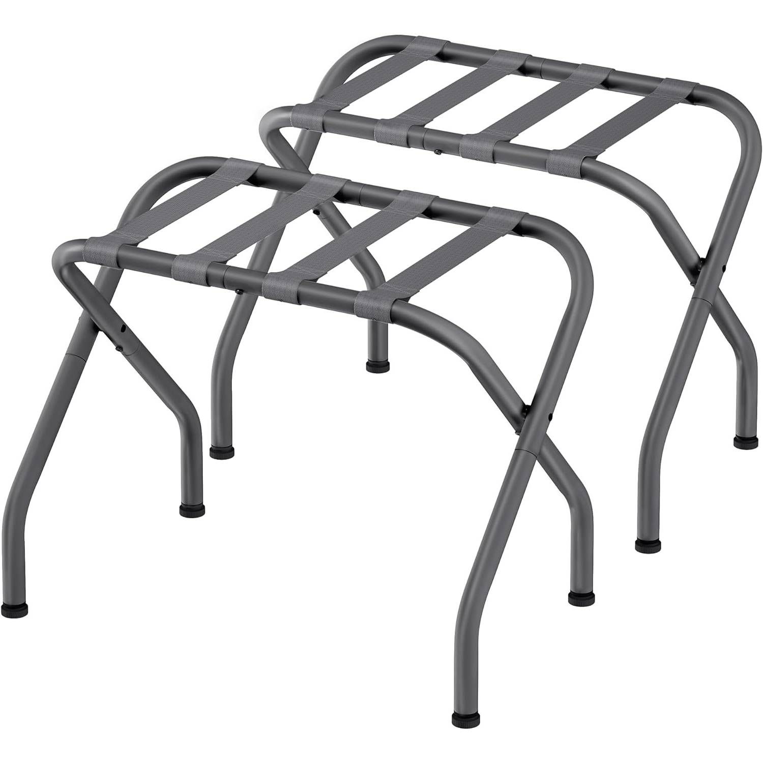 Make your guestsÂ’ stay more comfortable with this Set of 2 – Sturdy Grey Metal Folding Luggage Rack. It keeps the luggage off the floor to save you or your guests from bending down to the floor, making packing and unpacking for trips much more easier. Fastened to the steel frame, the nylon straps will always stay in place without moving during use; the suitcase stand is strong to hold up to 110 lb; the adjustable feet improve the stability and wonÂ’t scratch the floor. Each luggage rack conveniently folds to a size of 27.2”D x 4.3”W x 26”H (69 x 11 x 66 cm) for easy storage in smaller spaces. Its standing size of 27.2”D x 15”W x 20.5”H (69 x 38 x 52 cm) can accommodate 22”, 24”, or 26” suitcases. A steel luggage rack for guest rooms with a foldable design, adding extra storage while being a nice touch to any room.