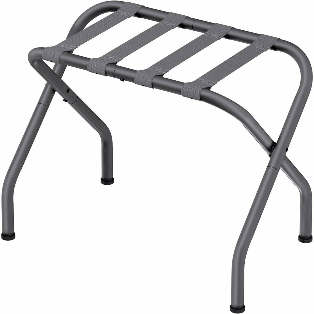 Make your guestsÂ’ stay more comfortable with this Set of 2 – Sturdy Grey Metal Folding Luggage Rack. It keeps the luggage off the floor to save you or your guests from bending down to the floor, making packing and unpacking for trips much more easier. Fastened to the steel frame, the nylon straps will always stay in place without moving during use; the suitcase stand is strong to hold up to 110 lb; the adjustable feet improve the stability and wonÂ’t scratch the floor. Each luggage rack conveniently folds to a size of 27.2”D x 4.3”W x 26”H (69 x 11 x 66 cm) for easy storage in smaller spaces. Its standing size of 27.2”D x 15”W x 20.5”H (69 x 38 x 52 cm) can accommodate 22”, 24”, or 26” suitcases. A steel luggage rack for guest rooms with a foldable design, adding extra storage while being a nice touch to any room.