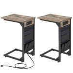 Be ready for life with these handy Farmhouse Charging Station C Shaped End Tables – Set of 2! No more yielding to fixed household power outlets, the side table has a 6.6 ft power cord to gain a large placement Each charging station contains 2 outlets (110-125V 12A) and 2 USB ports (5V 2A). Expect for the 16″ x 12″ (L x W) tabletop, the end table also features a 15″ x 9.5″ (L x W) side bag that consists of 2 long bags and 3 small bags. The c-shaped end table boasts a strong and rustproof metal frame, which contains triangle metal for higher strength