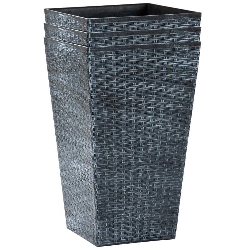 This Set of 3 – Grey Faux Rattan Plastic Tall Large Flower Pots give your space a classic modern touch! The rattan-style plastic makes it easy to get plants settled inside and allows you to drill holes at the bottom for water drainage if they are placed outside. Add some new life to any backyard, living, or office space with this set of 3 flower boxes.