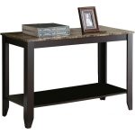 With a modern marble-look top and sleek dark espresso tapered legs, this Sofa Table in Dark Brown Wood Finish with Faux Marble Top appeals to any living space. The open bottom shelf can be used for added storage or to showcase decorative pieces. Perfect for the living room, the entryway or anywhere in your home to display your favourite accents in style.