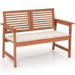 Solid Wood Outdoor Patio Garden Bench w/ Slatted Back Armrests and Seat Cushion