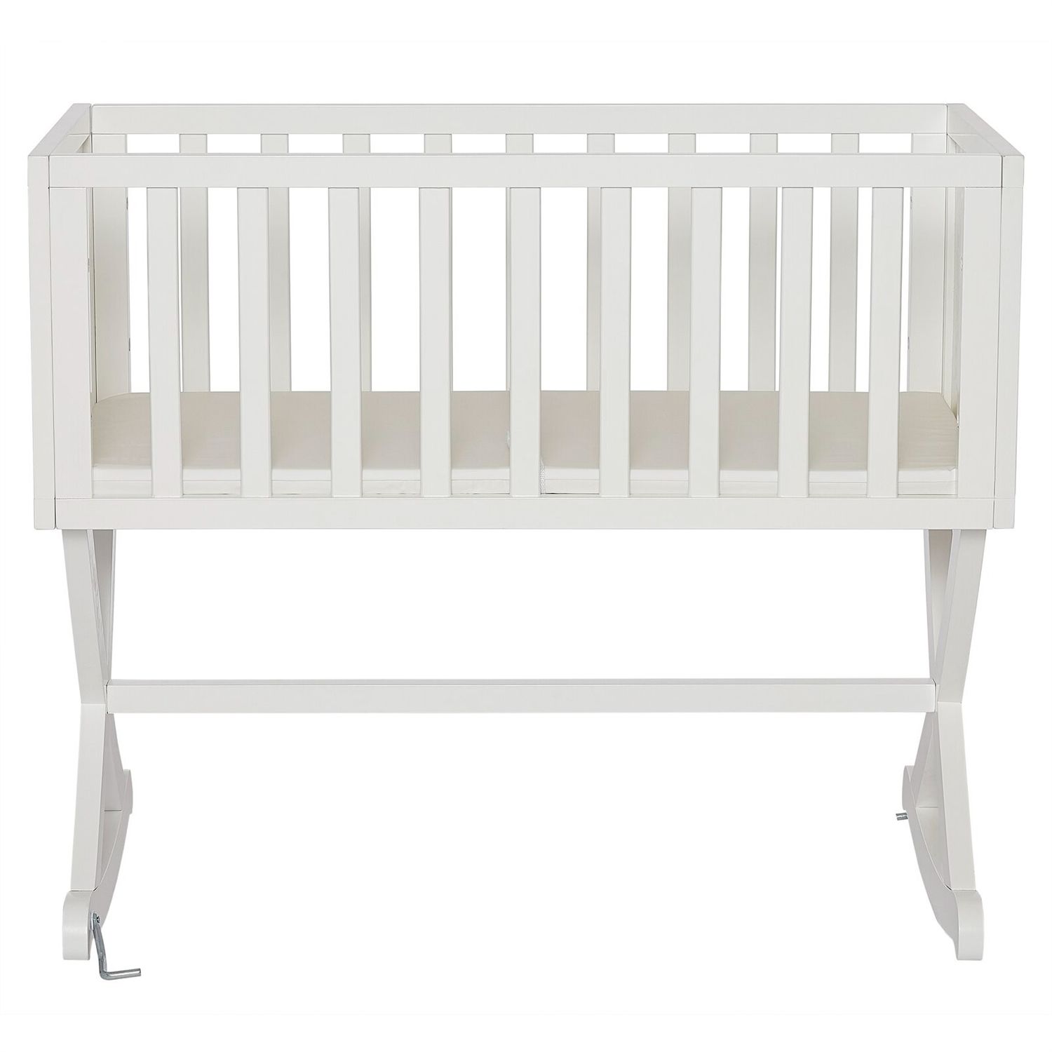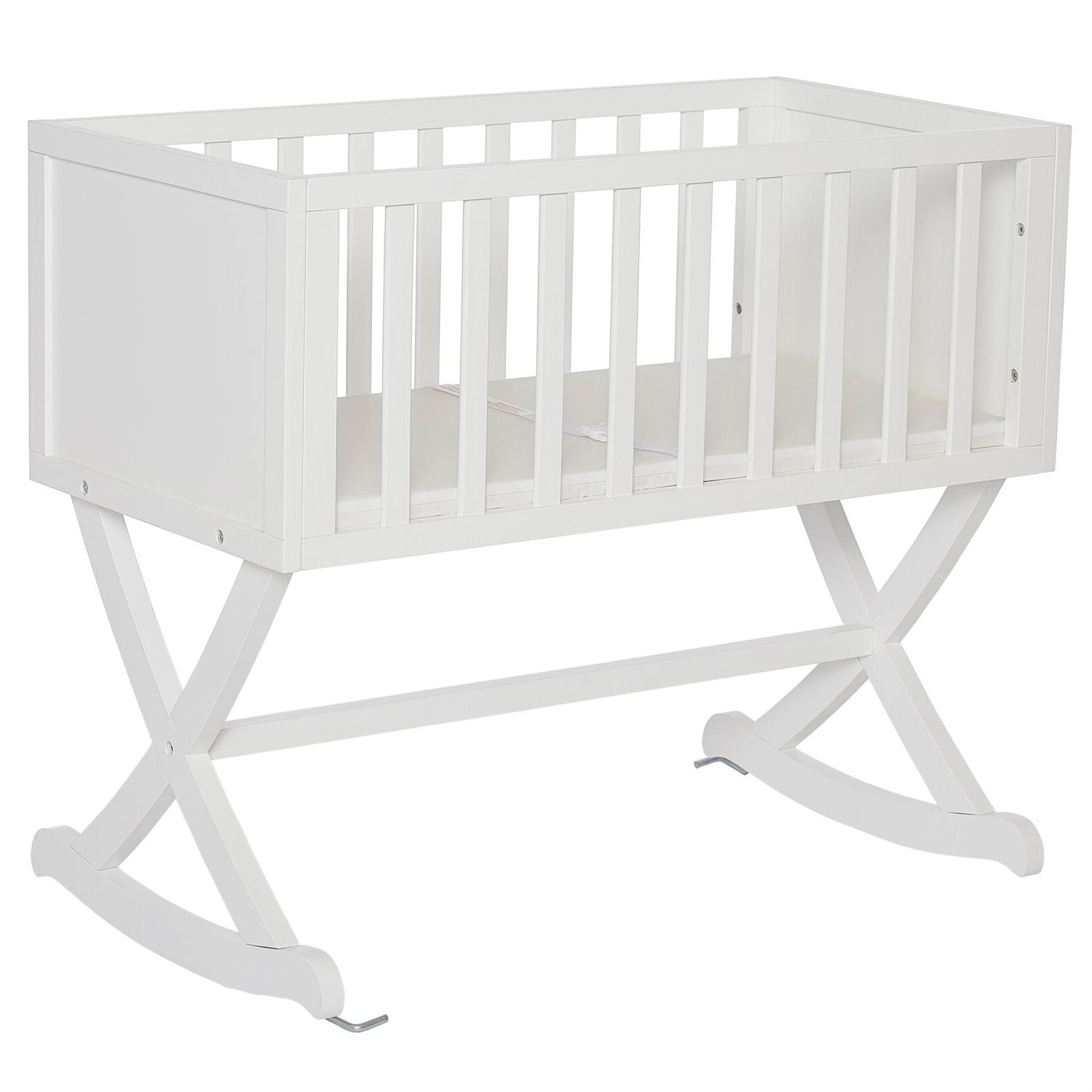 This Solid Wood Rocking Baby Glider Cradle with Crib Mattress in White Finish creates a cozy nest-like surrounding for your newborn. This cradle offers a simple and modern design by incorporating straight lines, a solid side panel with a soft mattress pad, and an x-cross base, which allows parents to rock gently their babies to sleep with sophisticated iron decors and pops of geometric prints that inspire a plush, peaceful, all-night comfort.