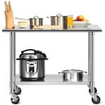 Heavy Duty 48″ x 24″ stainless steel kitchen island work table is the perfect addition to your laundry room, garage, home kitchen, or dining room. This portable table is made of durable 430 stainless steel to bear large weight and offer more stable service. The bottom shelf is fully adjustable to meet your storage needs. Most convenient of all, 4 universal wheels allow you can move the table smoothly and silently to where it is needed. Two of the wheels are locking.