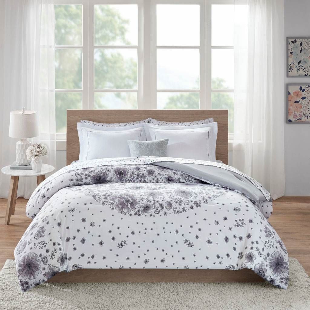 - Twin size 6-piece White Grey Floral Pattern Microfiber Comforter Set