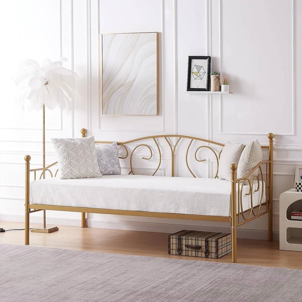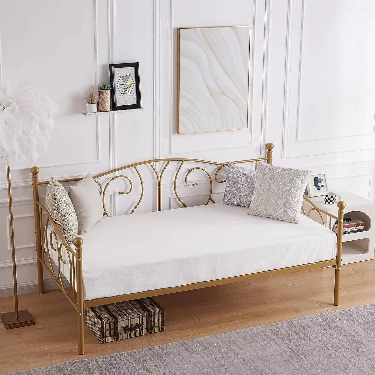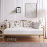 This Twin size French Country Style Gold Metal Daybed Frame structured with heavy-duty metal ensures durability and stability. Strong mattress foundation and no box spring needed. No mattress. 13 inches storage space under the twin daybed frame, offers more space for you to place an organizer container or storage box to tidy your clothes, toys, or quilts. This multifunctional twin size daybed frame can easily match a variety of home decor styles. It is an ideal choice for your bedroom, kids room, guest room, or living room. Twin size daybed frame dimensions: 79 X 41 X 39 in. Our daybed frame has a classic decorative appearance, giving you a comfortable sleeping experience. All parts are clearly labeled, please just follow the instructions and install this twin size daybed frame step by step. 2 people are recommended to install.