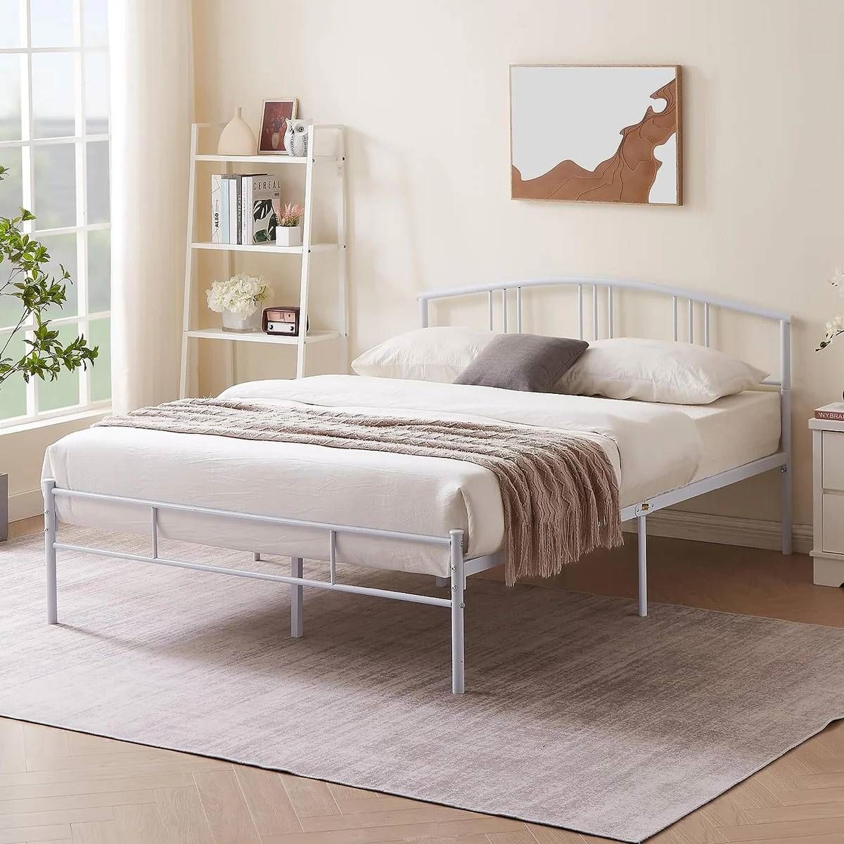 This Twin size White Metal Platform Bed Frame with Arched Headboard features curved designs of headboard and straight foot-board, adding warmth and active to your room and provides you a comfortable sleeping and sitting experience. Ideal for a kid’s bedroom dormitory, guest or living room. The metal bed frame is constructed of sturdy metal slats, side rails and 9 solid legs which could hold up to 330lbs. It uses foam padding inside to ensure noise free. 12.4 inch clearance underbed storage, 9 heavy duty support legs, together with 12 metal slats, this bed frame, strong and durable, matching the majority storage box and luggage,provides you with strong support for a relaxing sleep. Each order comes with a clear and detailed instruction. Simplified installation steps and numbered parts are easy to assemble and you can generally finish setting up easily in a few minutes.