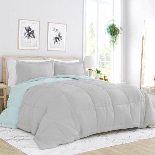 Elevate your bedroom or guest room with this classic Twin/Twin XL 2-Piece Microfiber Reversible Comforter Set Aqua/Grey. We love that this set comes in a range of colors, so you can find just the right look for your space. ItÂ’s also reversible, so you can switch up your look with ease. All pieces are made of 100% microfiber, which is lint-free, non-pilling, and resistant to wrinkles; theyÂ’re also machine washable, so keeping everything fresh and clean is a breeze. The comforter and shams are filled with 5.31 oz. fill weight polyester in a solid hue with a baffle box weave.